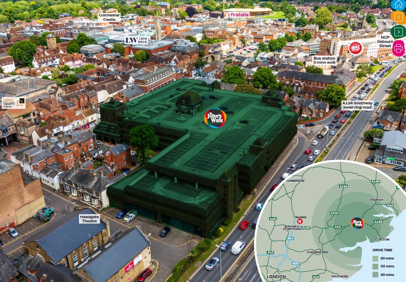 The Centre which is arranged over four floors and completed in 1993 provides extensive ground retail space of approximately with an excellent frontage to the covered pedestrian mall which has two entrances onto St John Street.